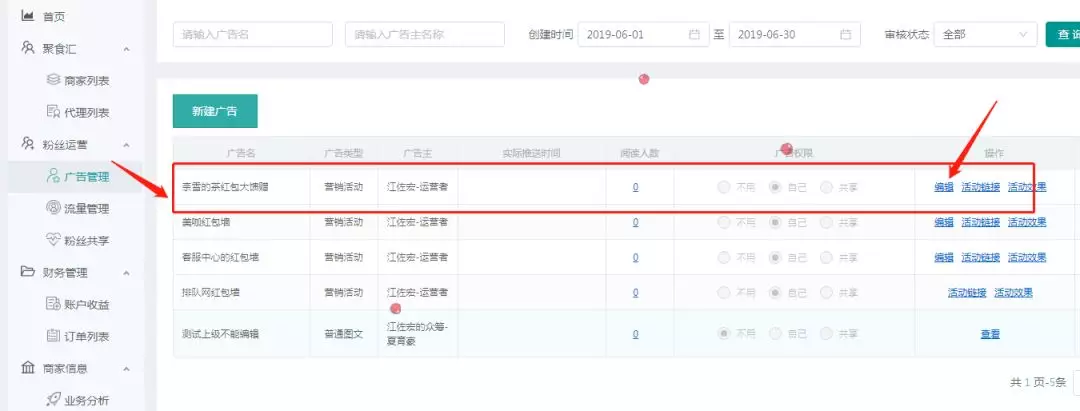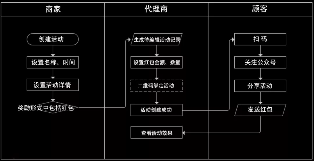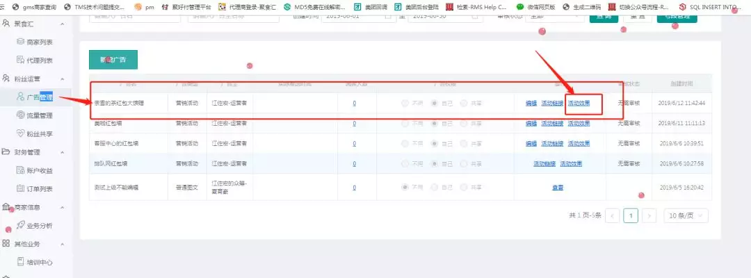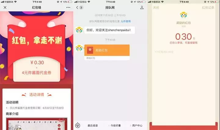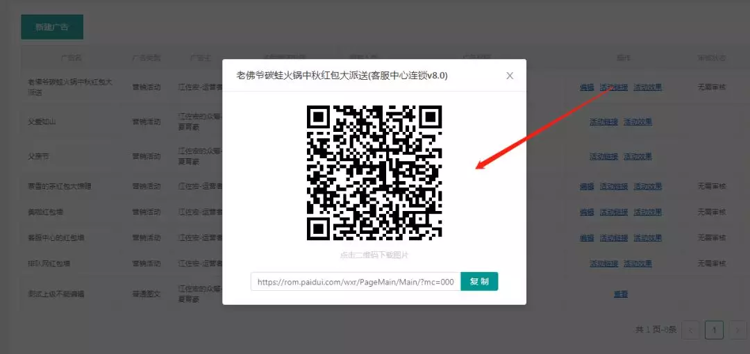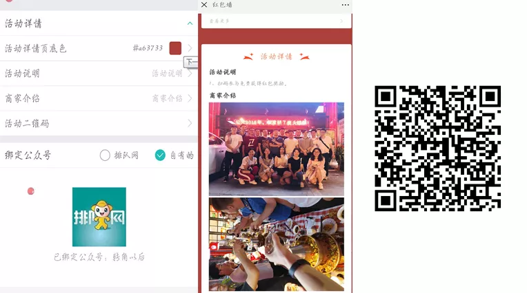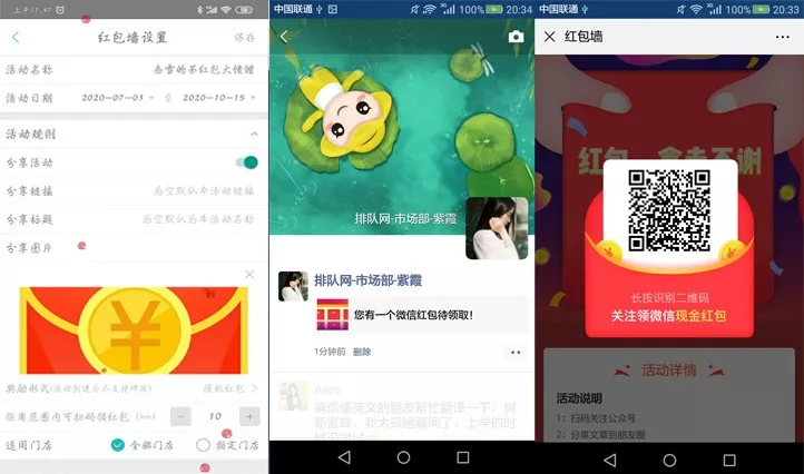 【简言之,就是商家创建活动,代理商设置红包金额、数量等,完善活动信息,顾客只要分享活动就能领取微信红包。】 接下来,我们就来进行步骤详解, 让您看一遍就能上手!!! 01 创建活动 打开排队网APP营销界面→红包墙→点击下方创建活动 分享活动:开关控制扫码领取红包时,是否要分享活动链接到朋友圈才能领取红包。 >分享链接:默认即可无需设置;也可以自定义设置; >分享标题:默认即可无需设置;也可以自定义设置; >分享图片:显示在微信朋友圈里的图文消息链接展示; 【自定义分享标题和链接、分享后获取红包、朋友圈消息显示标题和分享图片】 当分享链接和分享标题使用系统默认参数,不设置时,效果如下: 奖励形式,红包奖励内容可以设置为4种方式: ① 随机红包(随机金额); ② 普通红包(固定金度); ③ 普通红包+优惠券(仅支持代金券和实物券); ④ 和优惠券。(每个红包最低0.3元最高200元) 距离范围可扫码领红包范围限制(km):用于限制客户参与商家活动,地理距离管控,防止资源浪费。 (定位根据顾客关注公众号时,确认授权获取用户手机地理位置) 注意:如果奖励形式为:普通红包+优惠券,优惠券参数是在app上设置,红包参数是在pm平台设置。 活动详情展开: >活动详情底色:默认即可 >商家介绍:用于上传商家宣传图片(图二) >活动二维码:用于制作物料,到店扫码参与领取红包活动,也可通过公众号文章群发时嵌入使用。(图三) 参数配置保存后,活动状态显示为待完善,到此第一步新建红包墙活动完成。 02 红包墙PM平台配置 第二步将由代理商,登陆pm平台进行操作,设置红包充值和发放红包条件限制。 下面,将开始演示红包墙PM平台配置过程~ PM平台: 代理商登陆pm平台:http://pm.paidui.com 点击左下角系统设置进行红包充值,充值金额用于红包墙活动账户金额。 充值完成后,我们打开粉丝运营进入广告管理,就可以看到我们刚才在App创建的红包墙活动,点击编辑进入红包参数设置。 进入红包参数设置我们可以看到如图需要配置的参数: 奖励形式:同步跟App设置奖励形式一致,无需配置; 单个金额:指定普通红包每个固定金额; 红包总额:当奖励形式为随机红包时,设置本次活动需要发放的红包总额。 (下面左图为普通红包设置,右图为随机红包设置) 奖励数量:指定本次红包墙活动发放红包总数。 确定并保存参数,到此第二步操作完成. 03 导出红包二维码 红包墙创建后可以通过5种入口参与活动: ① 通过pm平台活动生成的活动链接,放置到公众号做自定义菜单; ② 通过公众号推送的活动宣传文章,嵌入二维码或活动链接群发粉丝; ③ 通过好友分享活动链接进入; ④ 通过导出PM/App上生成的活动二维码,制作门店物料,顾客到店扫码参与; ⑤ 通过广告公下方司制作大型红包墙,游客和粉丝刮卡扫码领取。 (同一个红包墙活动仅限每人参加一次) 下面将演示大型红包墙二维码如何导出多个二维码: 首先,申请号段,申请号段是因为系统默认只会生成2000个,当我们要制作红包总数超过2000个需要申请号段补充。 假设当前我未绑定可使用号段有9200个,但是我需要发10000个我就需要在申请800个号段。 申请完800个号段后,可以看到系统自动又生成800个号段,目前可用为10000个; 接下来,我们进行下一步,公众号绑定二维码: 如果没有绑定公众号就会出现,扫红包墙二维码关注的是排队网公众号,而非商家自己的。 所以要先选择号段范围,由于系统浏览器只允许一次性,下载导出绑定二维码只有500个,我们需要先指定一个号段范围,并过滤号码没有绑定过其他公众号的进行绑定。 演示:本次我筛选了500个没有绑定过其他公众号的号段: 全选过滤出来的500个号段,点击右下角绑定公众号 选择要绑定的商家,点确定,即可关联上商家公众号: 绑定商家后,就可以进行下载导出红包墙二维码。 导出二维码有两种形式:一种是链接形式,一种是二维码。(根据广告印制公司要求导出需要的形式即可) 二维码导出结果如下: 注意:红包墙的二维码,同一个微信号扫码领取过后即刻无效,不能存在重复情况,,App上的活动二维码领取红包同理。 04 红包墙活动体验展示 ① 扫码进入红包墙活动界面长按识别二维码; ② 关注公众号后收到红包推送领券消息; ③ 点击消息进入领取红包界面; ④ 点拆开红包,提示需要分享后方可领取红包; ⑤ 分享到朋友圈后,立刻获得红包奖励,通过排队网公众号发放; ⑥ 领取后,红包金额自动存入微信零钱。 是否要分享后才能领,这一步我们在APP可以控制不用分享扫码就能直接获得。 但为了引流快速扩展粉丝和扩大商家知名度,建议开启分享后领取红包~ 05 红包墙设置完成的注意事项及效果查看 PM平台配置完成后,我们可以看到红包墙活动变为开启状态可以正式使用。 活动按钮为开启状态下,不允许修改参数,修改参数不生效;修改参数需要先关闭活动状态,修改参数后,开启活动才能生效使用。 红包墙活动效果数据查看: 进入PM广告管理→找到相应红包墙活动→如图查看或看活动效果 通过活动效果,我们可以按日期查看到对应红包活动: 新增粉丝数/分享人数/浏览次数/发放红包金额/发放票券数等数据 最后一点重要提醒: 不要在活动结束前将商家切换上级代理商 红包将发放不出(红包墙活动属于原代理商,未与新代理商建立关系),还有可能会出现其他未知错误。 好了, 今天有关红包墙的操