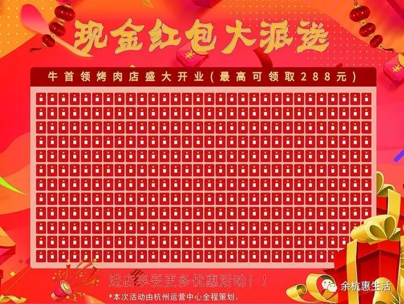活动内容:活动期间,准备一面红包墙,进行红包墙扫码,优惠大酬宾,现金红包大派送活动,顾客进店扫码分享活动信息到朋友圈即可随机抽取微信红包,最高可领取288元。