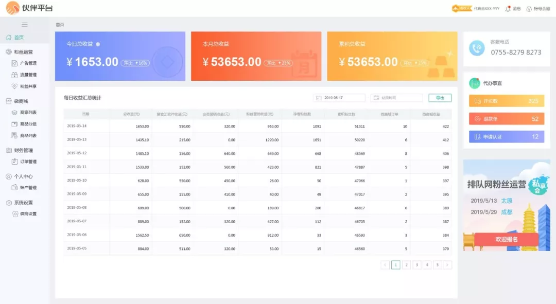 太多复杂的问题,与其寄托于足够大的流量,不如换个思路! 我们如何帮助商家 增加销售渠道?商家的需求?成本如何? 01 营业较好的商家 我要做分销、我要做品牌 1. 用微商城建立自己的线上销售渠道,此外,还可以发展分销商,让分销商帮你分销产品或推广店铺广告内容,反正也没啥成本,多几个销售渠道,说不定就成了呢? 微商城-分销市场 2. 除了商城商品分销,我们还有粉丝推广员,小成本的红包金额就可以让大量的粉丝裂变,迅速让更多人帮你销售,在快速建立品牌、打响知名度的同时,营收增多。 02 营业一般的商家 我要扩大收益,我要赢得回头客,我想引流 1. 自己主动到店消费的基本上是忠诚粉,所以,若之后营销内容是精准定向投放,进行精准营销,实现“无干扰”、“利他性”消息推送,通过“实际上可用的优惠”打动粉丝,赢得回头客不在话下。 2.除了菜品优惠,其实我们还可以在思维上进行创新,如果你有好的食材供应链渠道、食材渠道、原材料渠道等,那你可以拓展销售渠道,开通线上商城,提升到家收益。 微商城-相关设置 3. 粉丝不够?找粉丝共享啊,微商城具备的推广功能,可针对店铺附近有着相同喜好的粉丝群发一下,你猜猜会成功么?至于附近?相同喜好?百万粉丝?简单,给你安排,排队网有完善的精准粉丝画像,借助其标签化、消费行为等属性,是帮助你实现个性化推荐、精准营销强有力的前提基础。 粉丝共享,精准推送 我们能给代理商带来什么? 流量主?广告主?分销商? 01 我有流量--我要变现赚钱 流量变现有多种方式: 1. 做商家的代运营,将商家接入微商城,增加商品的销售额,利用自己的流量做营销,向商家收取代运营费用; 微商城及货品分销 2. 做分销商,利用自己流量做供货商的引流,通过交易赚取差价; 3. 利用排队网粉丝运营平台的粉丝共享,承接广告主广告,收取费用,实现粉丝变现。 02 我有优质商家--我要赚钱 微商城助力实体店建设线上销售渠道,告别单一的销售渠道,利用粉丝分销和商品分销扩大商家品牌知名度。 对于优质商家而言,或许粉丝营销平台、商城、工具、方式等市面上已有太多。而排队网的优势在于线上线下的互通,对于粉丝的行为、属性、消费记录都有完整的记录,并逐渐让粉丝画像立体化,再结合聚客慧、聚食汇、粉丝共享实现千人千面精准营销。 商家满意、粉丝买单,价格一切都好说! 03 我啥都没有--我要赚钱 可以注册成为微商城分销商,从分销市场上面挑选合适的产品上架到自己的微商城来卖,赚取差价,没有成本,通过营销活动的转发,粉丝裂变,也能达聚沙成塔之效果。 04 我不急着赚钱--我要吸粉 微商城不仅是粉丝变现,也能吸粉?可以的,微商城无论是霸王餐还是海报分享带来优惠或福利,而且即使是不做营销活动,也架不住粉丝分销啊,用户简单操作下就有红包收入,怕是你自己也忍不住哦。 成本高么? 区别于其他平台,排队网微商城有个很大的区别,即可以在一个微商城账号下面管理多个商家和门店,那些只做一个商家就一个账号就要付一次钱的在这边就不用考虑了,低成本帮您打造本地生活圈。 商品的使用与核销均可以线上处理,无论实体店还是网店,脱离品牌机的约束,轻便操作易上手。 说了这么多,能真正落地么? 我们到底提供了什么? 微商城后台首页 1. 实体店多了一个低成本的线上销售渠道; 2. 商家可通过发展分销商或自销,增加收益,提升品牌效益; 3. 代理商盘活商家自有粉,营销不用担心掉粉; 4. 代理商可以打造自己的本地生活圈,管理多个商家的营销活动。 最重要:每个微商城都可以做为广告,通过粉丝共享精准推送到你的目标客户,实现真实有效引流。
