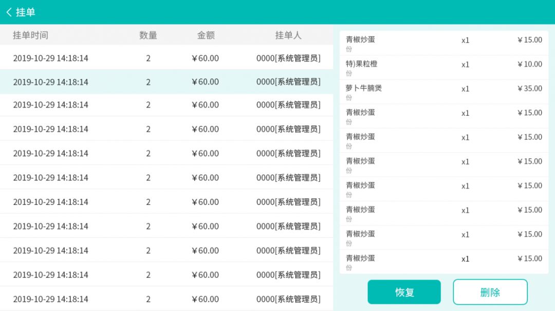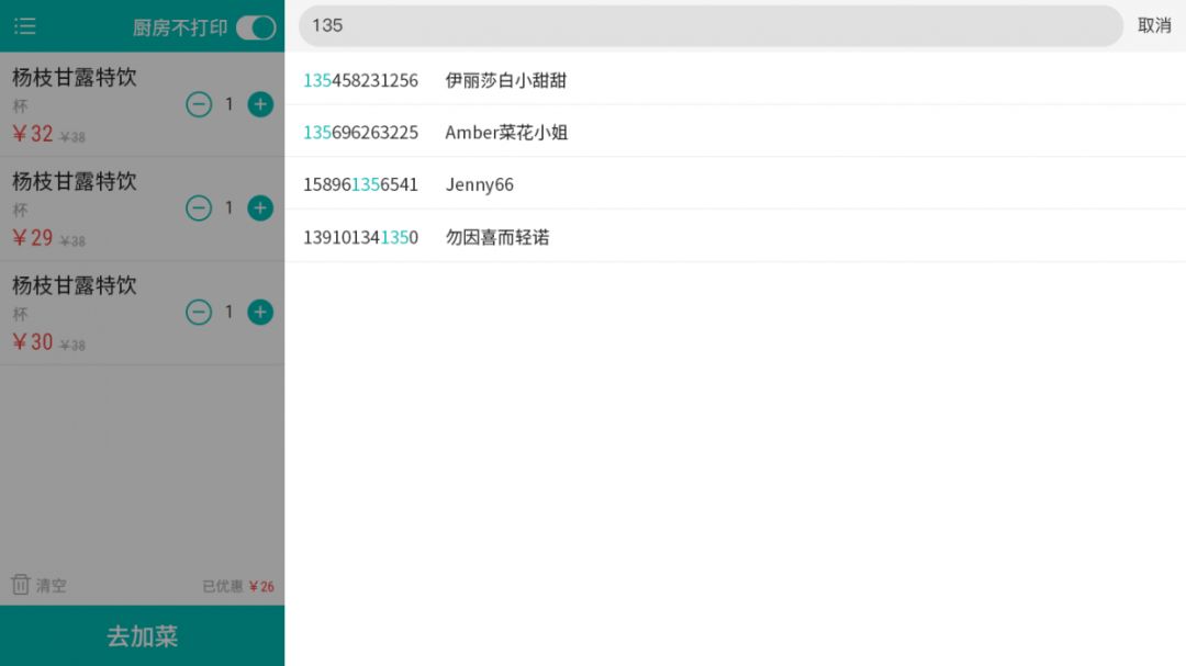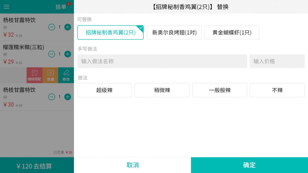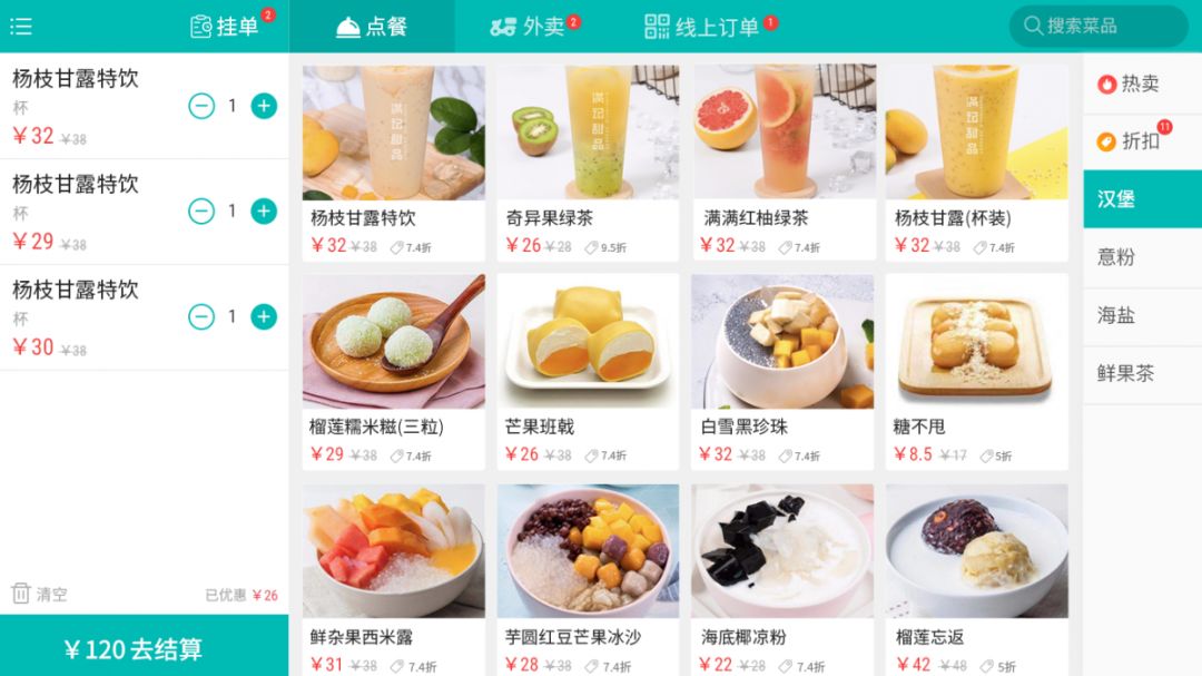 可满足店内普通菜、普通套餐、分组套餐,修改点单需求、挂单、取单等。