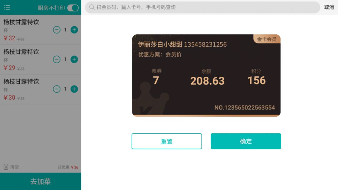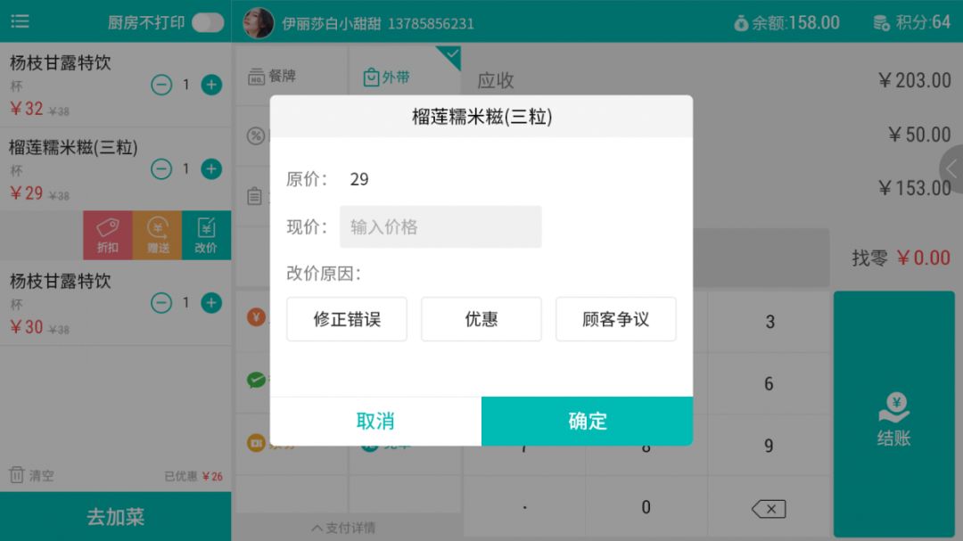 支持结账优惠价格更改、菜品折扣、菜品赠送、满减活动等;集成多种主流支付方式,如现金、票券、会员卡、微信、支付宝等。