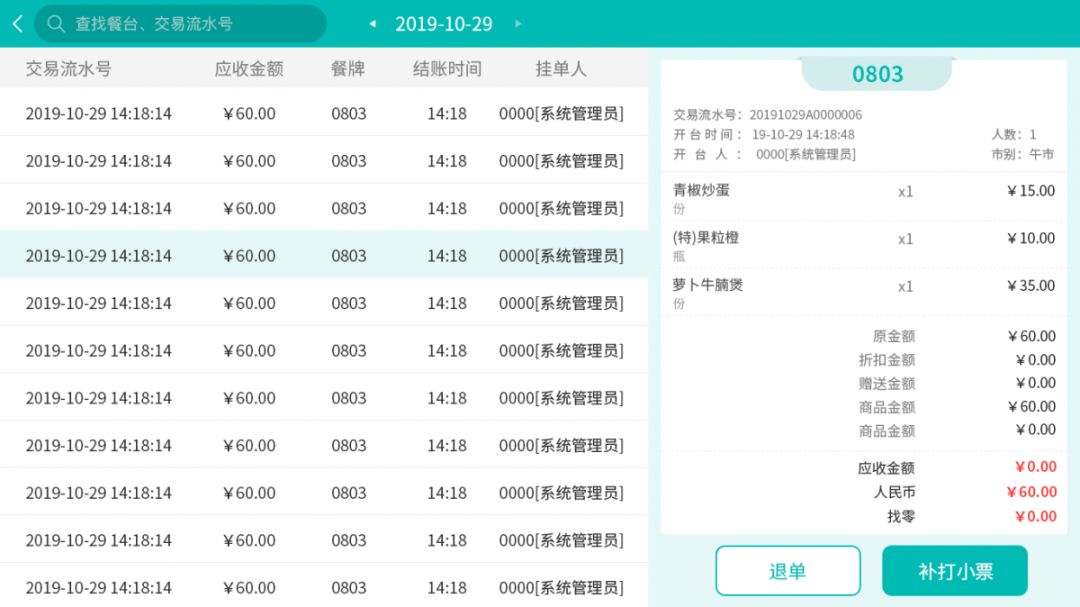 每日收银明细汇总,可实时查询账单,新增补打小票、退单功能,还可绑定手机端移动查询,足不出户了解店内营业情况。
