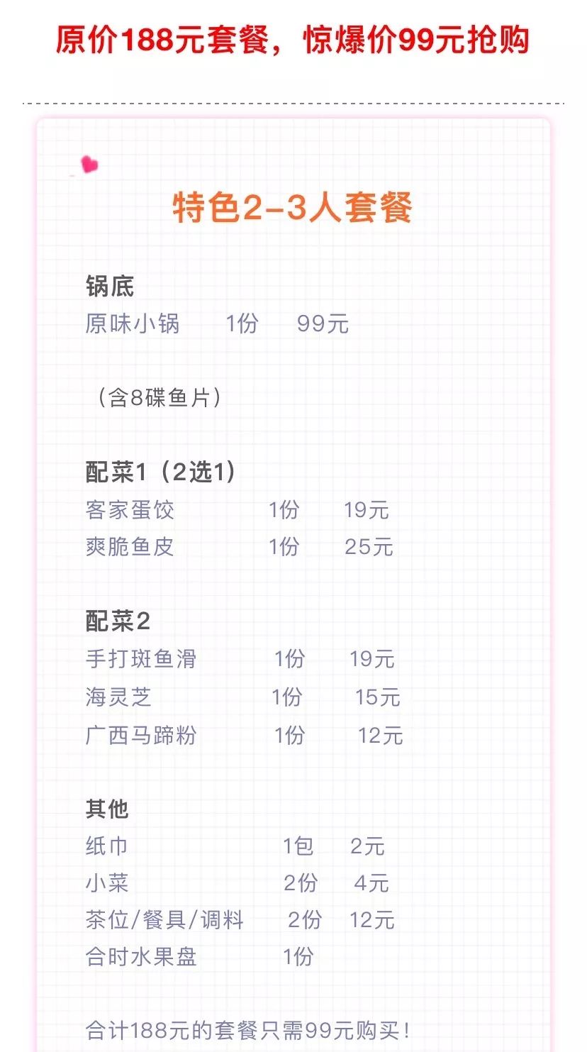12月是寒冷的冬季,火锅正属于这一季节的人气菜系,马家斑鱼主打养生鱼火锅,商家通过自身产品特点,顺势推出特色2-3人鱼火锅套餐。