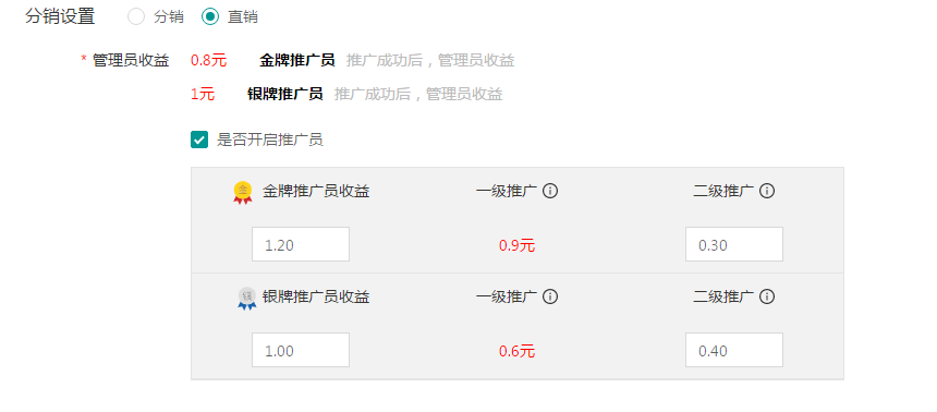 一个团队中分为上下两个等级,一级推广员和二级推广员。一级推广员的客户购买商品并且完成订单后,一、二级推广员会分别按照商品设置的推广费获得收益。