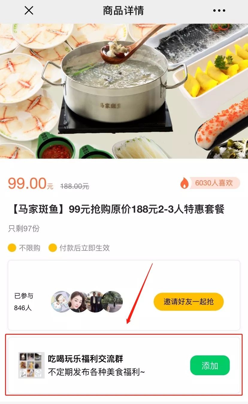 和关注吸粉同时更新的还有加群功能,在商品详情页增加进群按钮,几乎0成本获得精准粉丝,不仅为之后的商品宣传多增加了一条渠道,也能通过此方式更好的维护客户,增加互动,产生黏性。