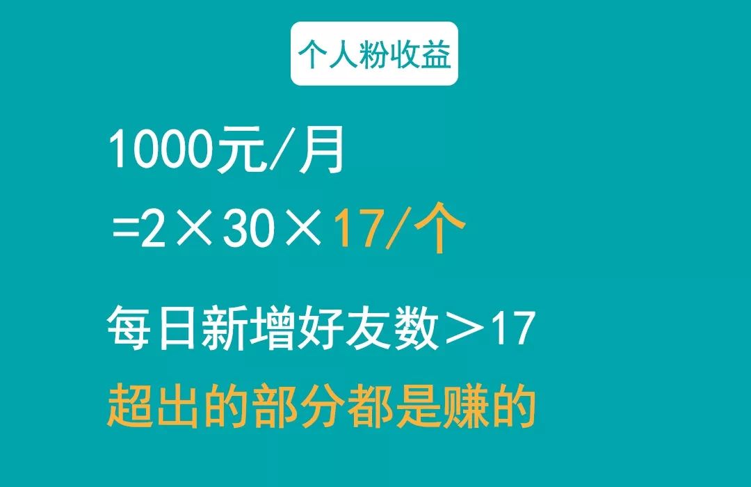 同样,个人精准粉市场价为2元/个,成本是1000元/月,分摊到每日吸的粉丝数=1000÷2÷30=17个,只要每日吸粉超过17个的部分就都是可赚取的收益。