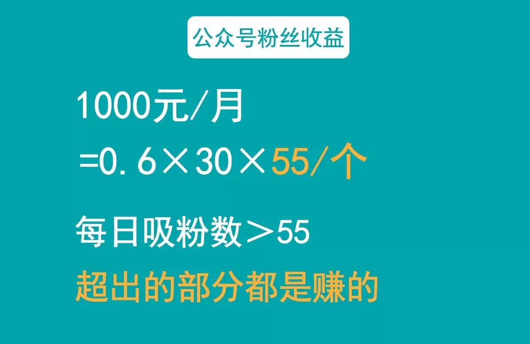 按照公众号粉丝市场价0.6元/个来算,每月1000元的成本,做到盈亏平衡,分摊到每日吸的粉丝数=1000÷0.6÷30=55个,也就是说,通过公众号入口只要使每日吸粉数大于55个,超出的部分都是你的收益。
