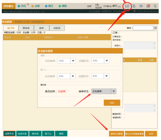 在聚食汇前台点击外卖小车图标→外卖状态管理→ 状态→开启接单即可。