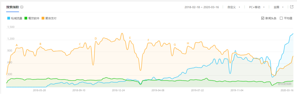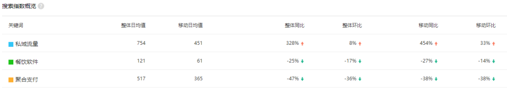 说到私域流量,从2018年起,私域流量的热度一直是持续上升的趋势,超越餐饮软件、聚合支付。从百度指数搜索可以发现,对比餐饮软件和聚合支付,在2018以前私域流量的关注度基本没有,而私域流量在今年的热度,无论是整体环比、移动同比、移动环比来说,私域流量的热度一直处于上升的状态。