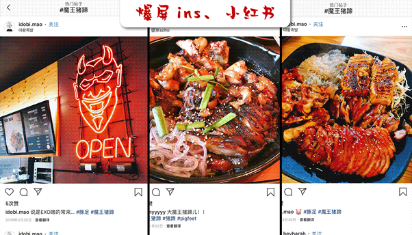 主要通过美食自媒体的文章进行推广,在浏览器搜索魔王猪蹄,可以看到各城市美食自媒体平台发布的宣传推文,在社交软件ins、小红书上也能看到他们的广告。我们能发现魔王猪蹄在前期对于广告宣传上是花费了许多成本的。