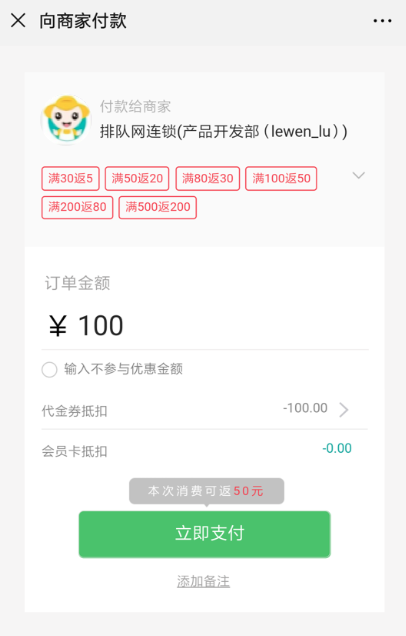 5、通过排队网轻会员功能,设置消费满返奖励,消费者付款成功后,即可收到公众号推送的满返奖励消息,不仅能满足消费者需要优惠心理,同时也为自己公众号顺势涨了一波流量。