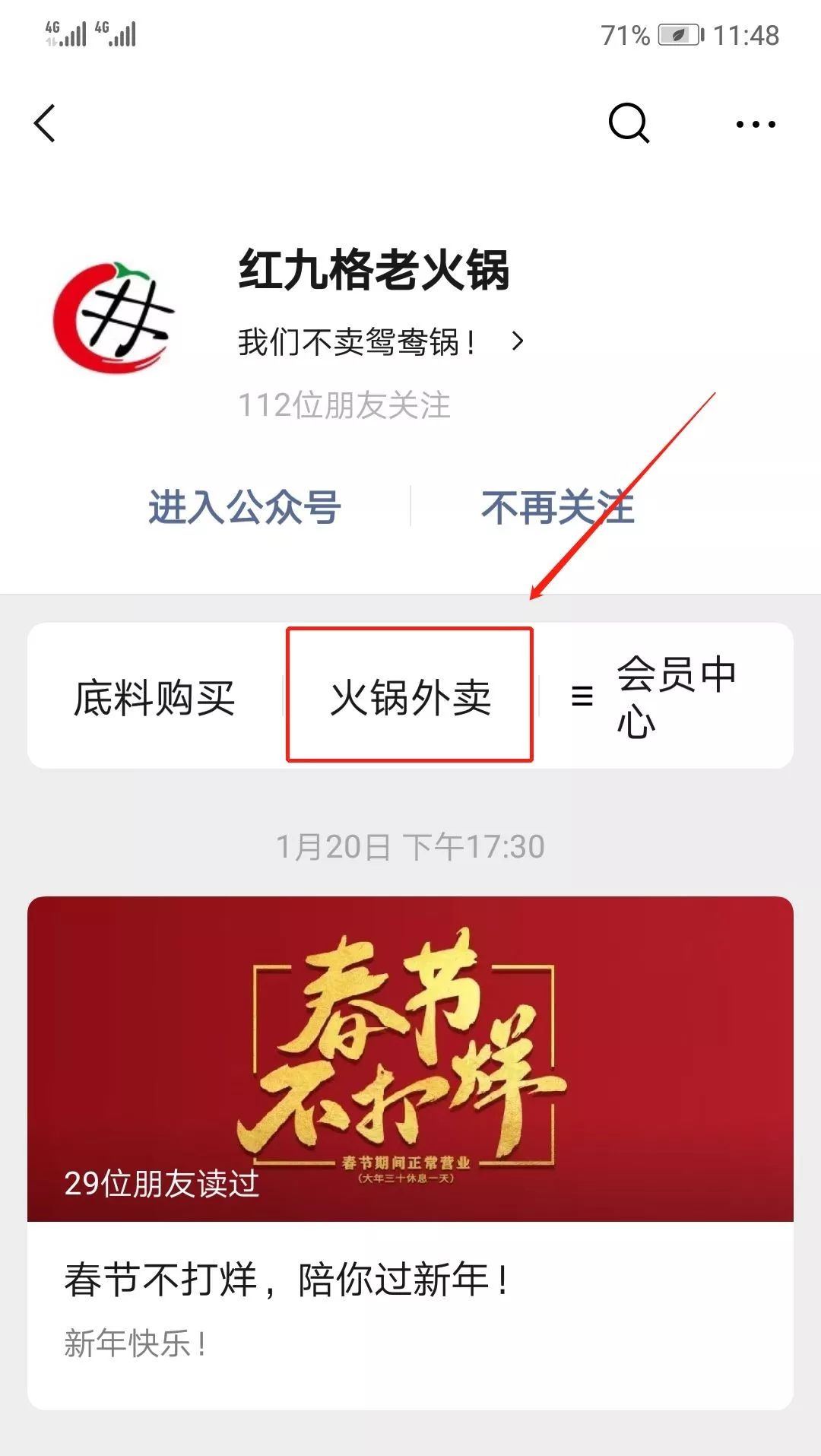 如排队网客户——红九格老火锅,通过餐厅积累的私域流量,在朋友圈、公众号上发布外卖订餐信息。
