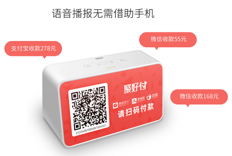 聚好付云音响:支持聚好付所有交易订单的语言播报、0.1秒时间极速语言报账、超长24小时待机、wifi+2g的双网模式支持内插流量卡,不用手机也能报账!