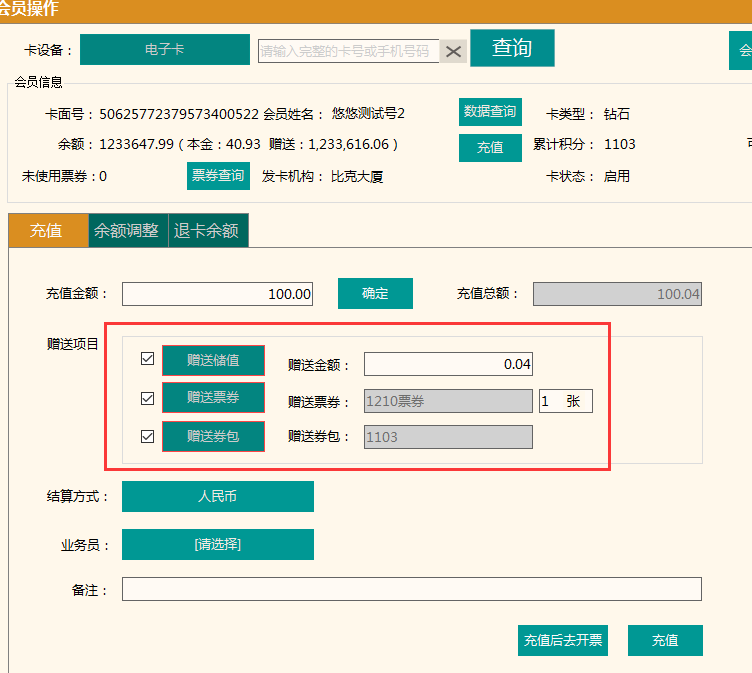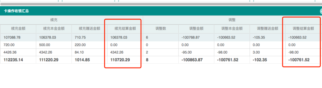4.【卡操作收银汇总】报表,续充/调整分别增加"结算金额"列,续充本金改为实际充值的本金金额
