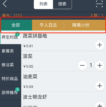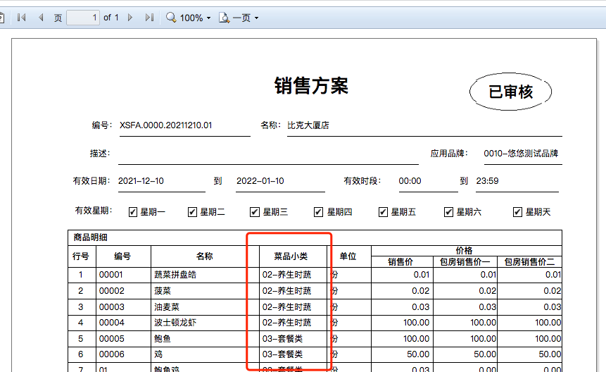 5.【销售方案】-预览,菜品类型替换成“菜品小类”