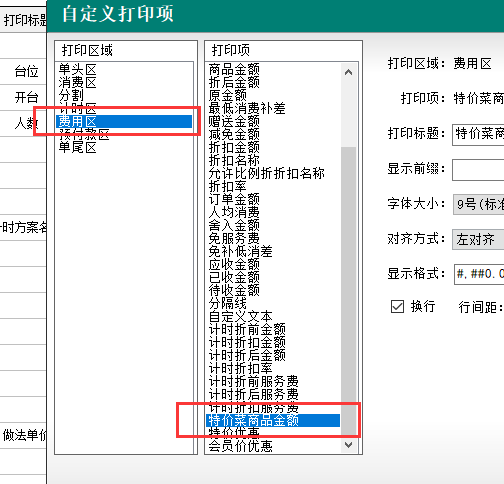 12.预结/结账小票-费用区,增加“特价菜商品金额”打印项
