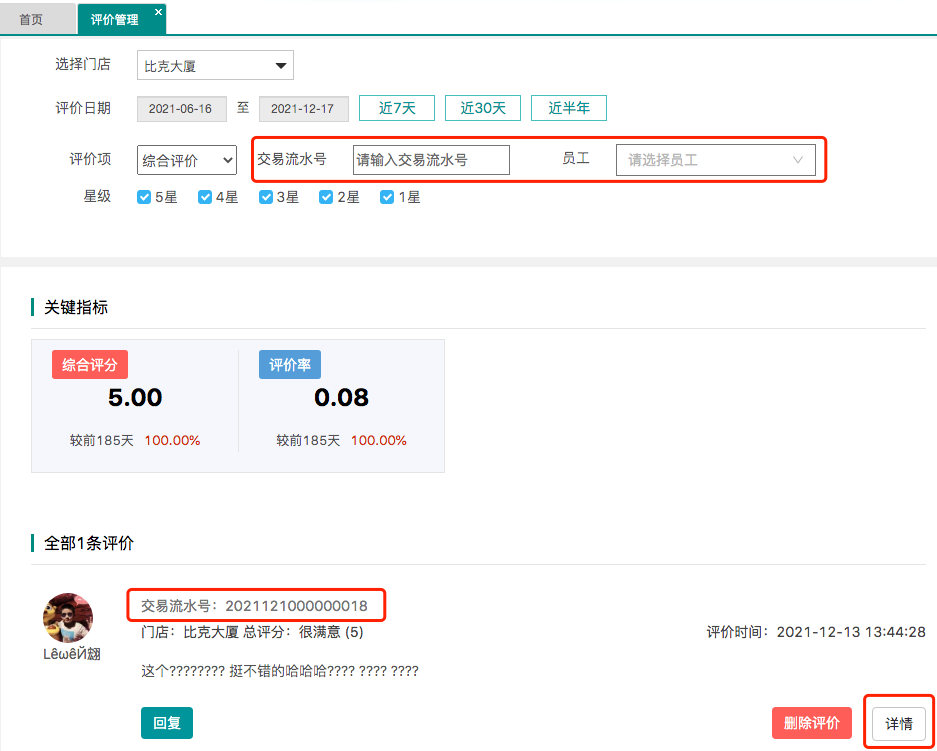 3.【评价管理】评价信息增加显示“交易流水号”/“员工详情”以及“交易流水号”/“员工”过滤查询