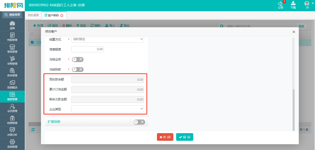 录入门店的批发客户资料,可查看客户累计订货金额,剩余欠款与创建日期