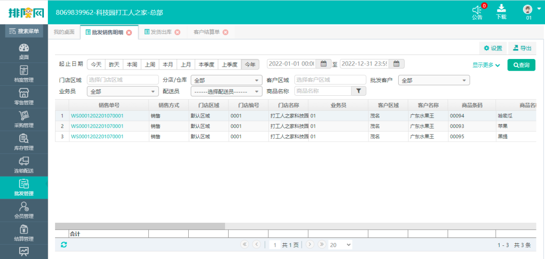 可以根据批发客户名称、时间多维度查看批发订单的商品信息明细报表;