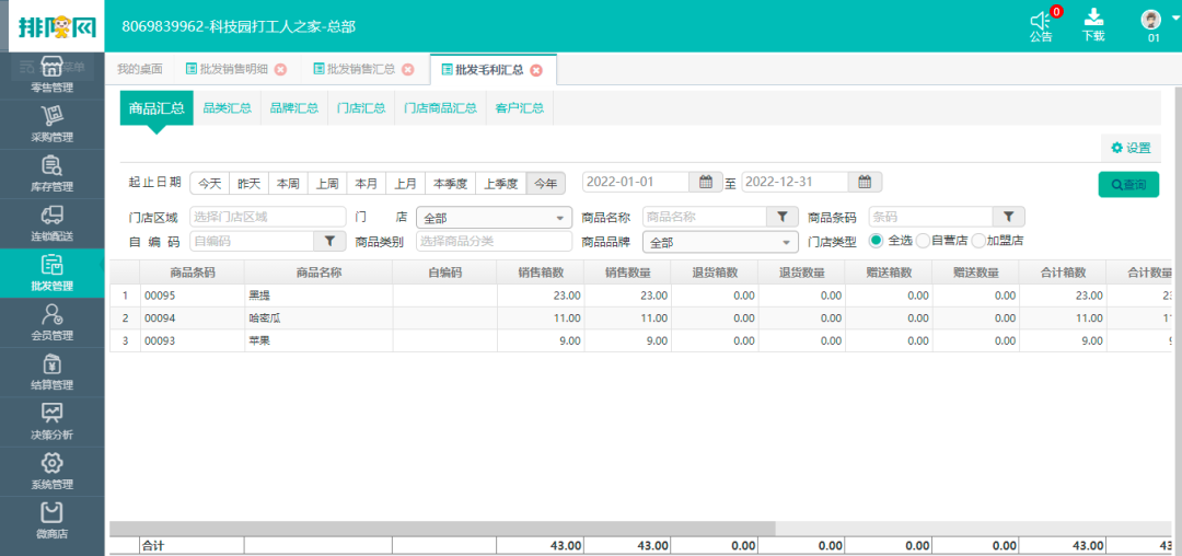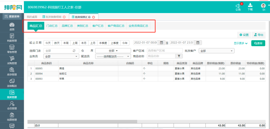 可以根据批发客户名称、时间多维度查看批发订单商品信息汇总报表;