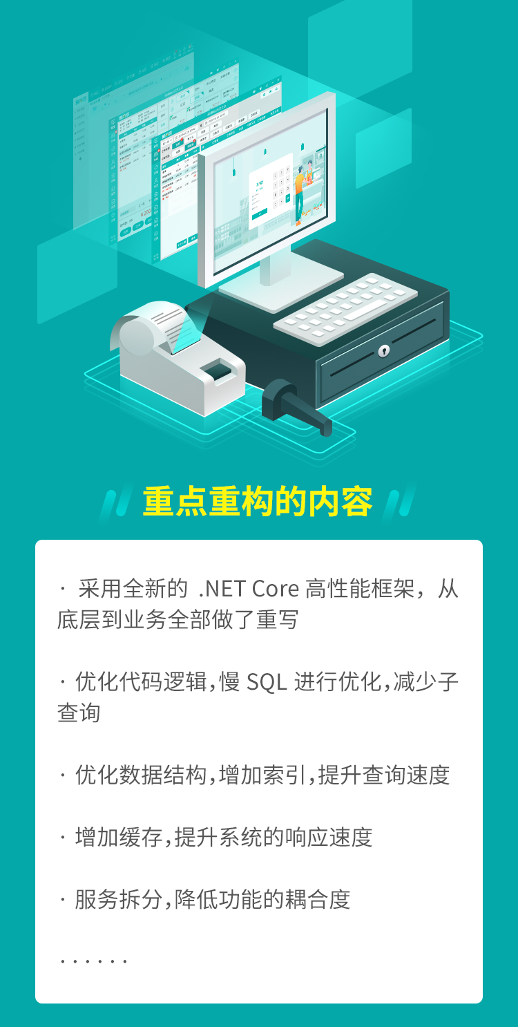 为了满足业务量爆炸性增长,保证系统的高稳定、高性能、可拓展性,以及对未来AI、大数据大规模应用的前瞻性考量,开发团队耗费5个月时间,投入80%骨干,基于10年的SaaS系统的开发经验,对原有系统从底层进行了全新的优化升级。