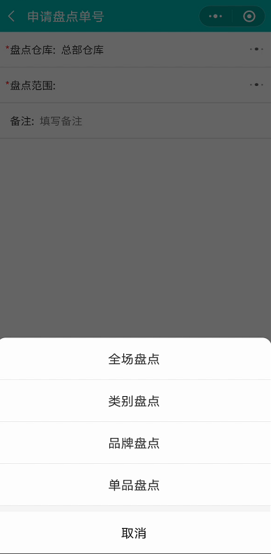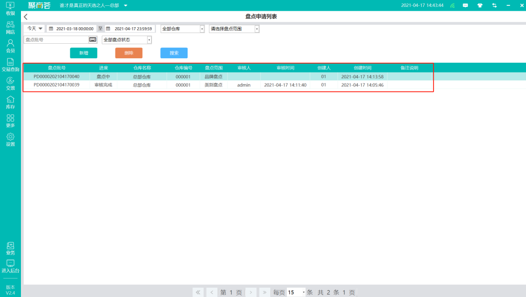 (2)保存后可在盘点申请列表查看已经申请的盘点批号、进度、仓库等,可按日期、仓库、范围等进行查找