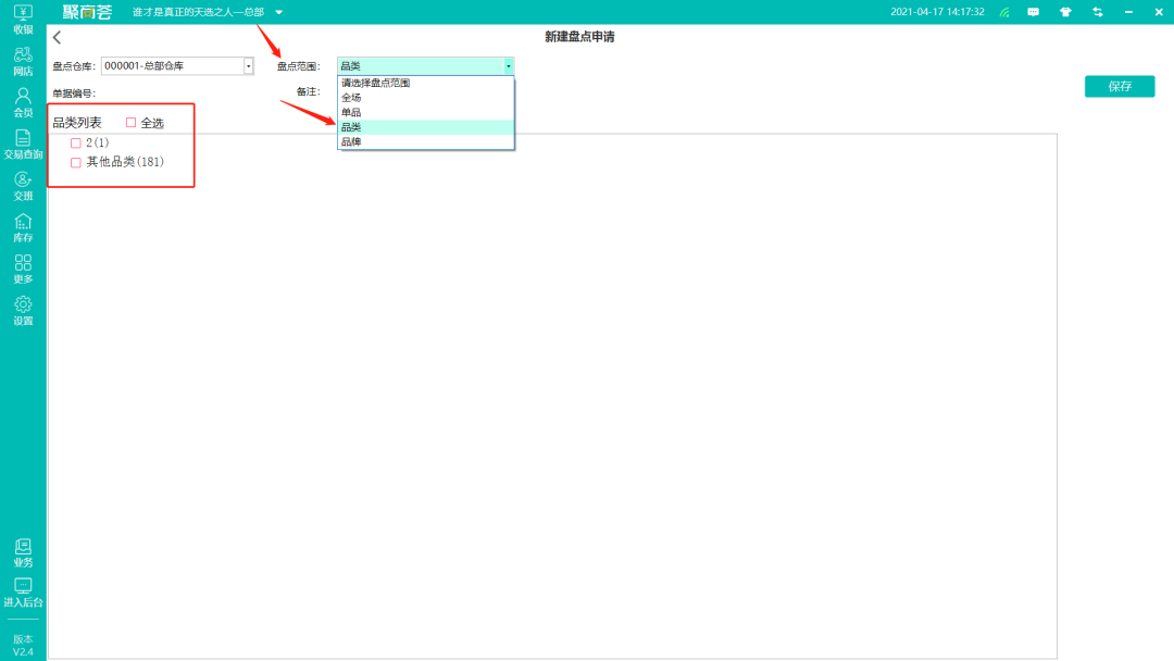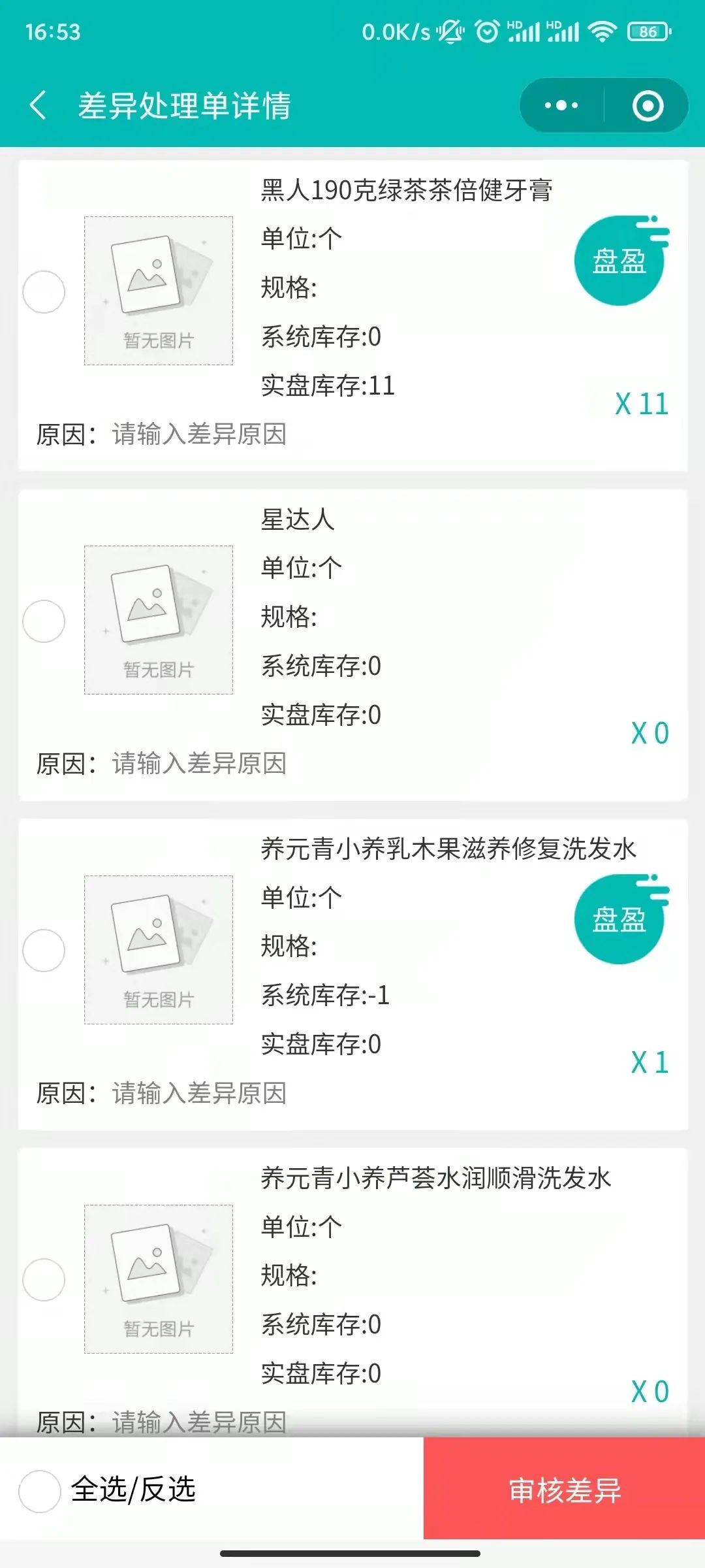 可按某个品类或者多个品类进行盘点该品类下的商品,盘点时只盘了部分商品时,其他品类商品在差异处理单中显示盘点数量为0