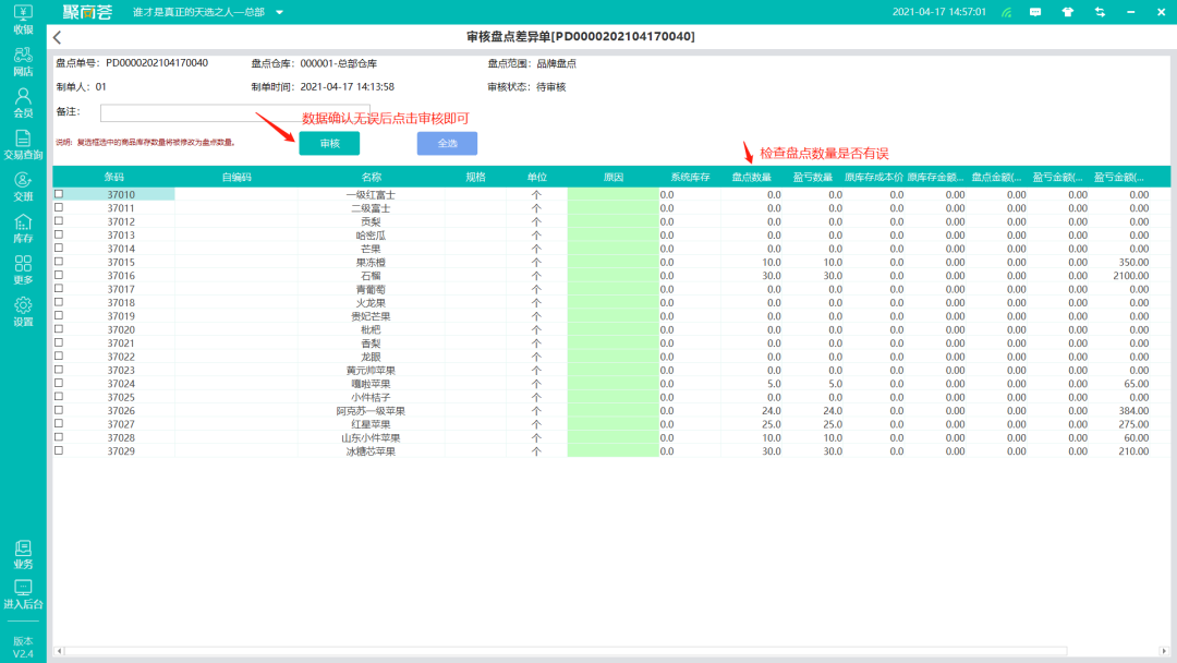 覆盖范围为门店所有管理库存的商品,盘点时只盘点了部分商品时,其他未盘商品在差异处理单会进行显示且盘点为0