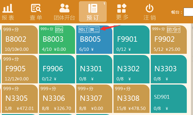 ①餐台预订状态时,在餐台上显示预订业务员名称