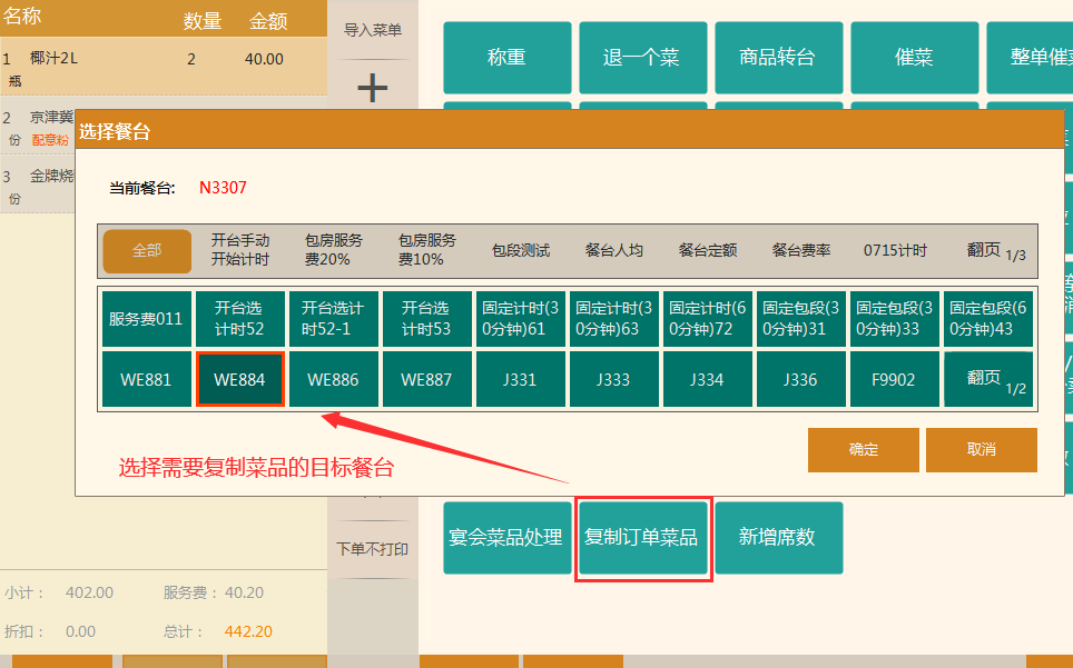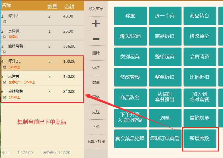 适用场景:酒楼菜品繁多,经常会有顾客看到邻桌吃的美味,提出想吃跟别人一样的菜品,这个时候,服务员直接复制邻桌的菜品过来下单即可。