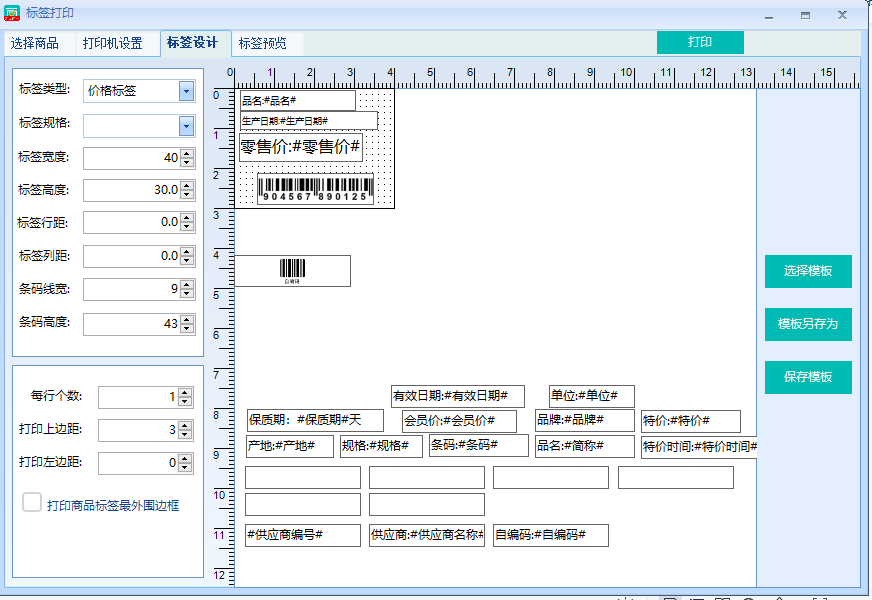 价签周围有标尺,对应的是价签纸的实际大小,系统支持对价签自定义排版,常用的标签关键词我们都备好了,直接拖拽使用即可。