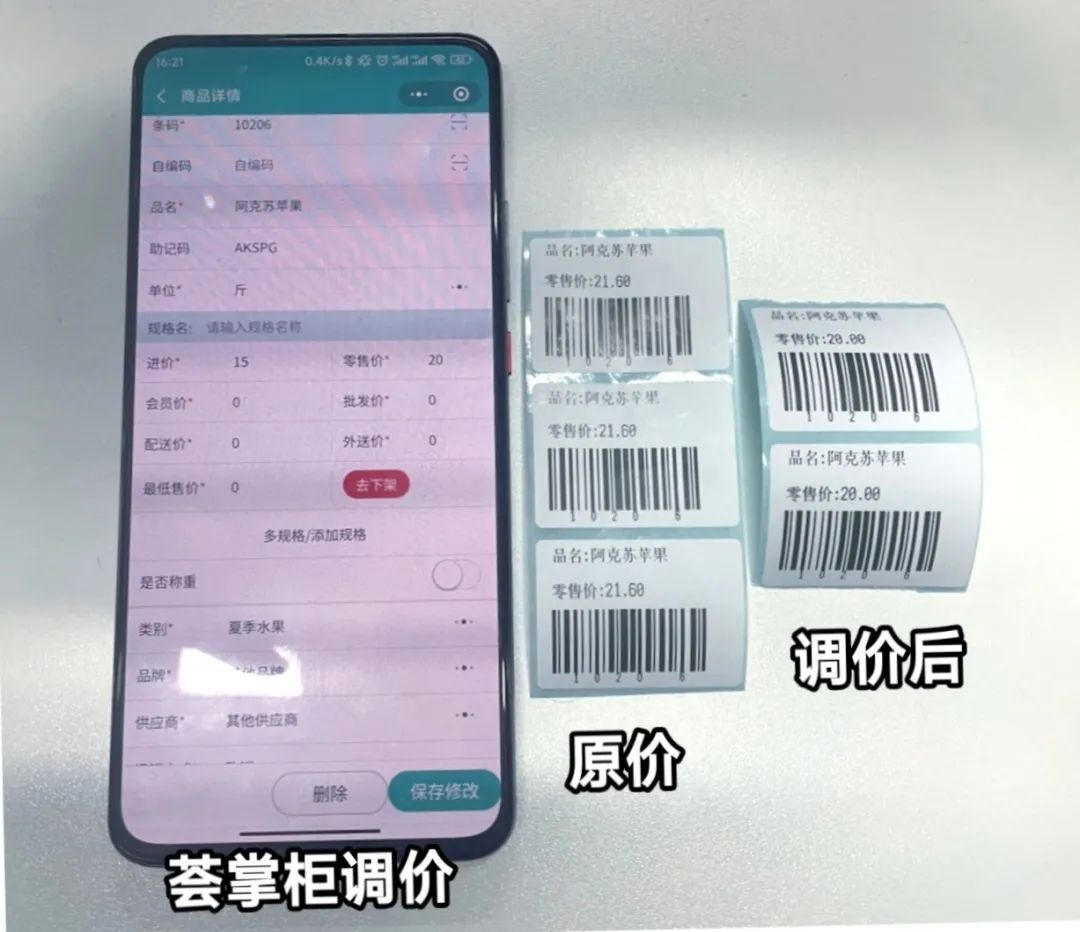 太简单啦!可以直接使用荟掌柜扫描这个包装上面的条形码,快速改价,再次打印标签就可以啦!
