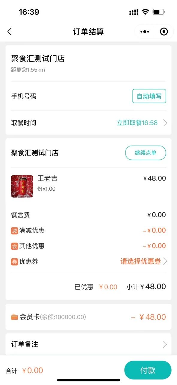 顾客选择取餐时间,核对购物车商品,选择优惠券