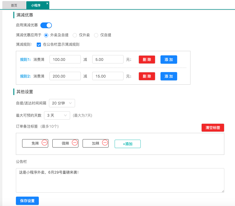 送达时间可选择跨天,后台支持餐盒费、配送费、满减优惠设置
