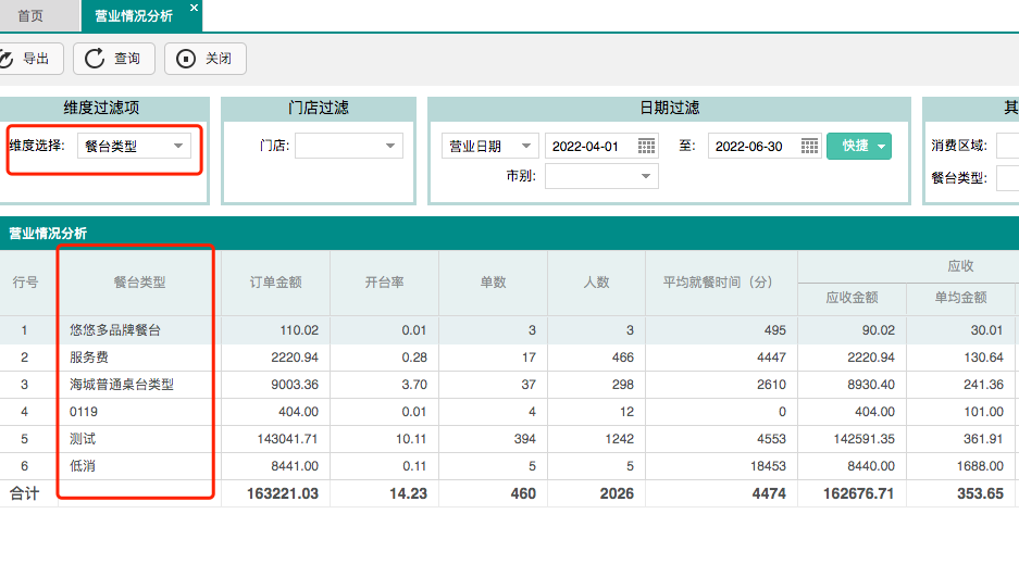 经营分析“营业情况”分析增加按【消费区域】及【餐台类型】维度查询