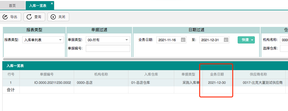 库存管理“入库一览表”-入库物料明细,增加显示【业务日期】列