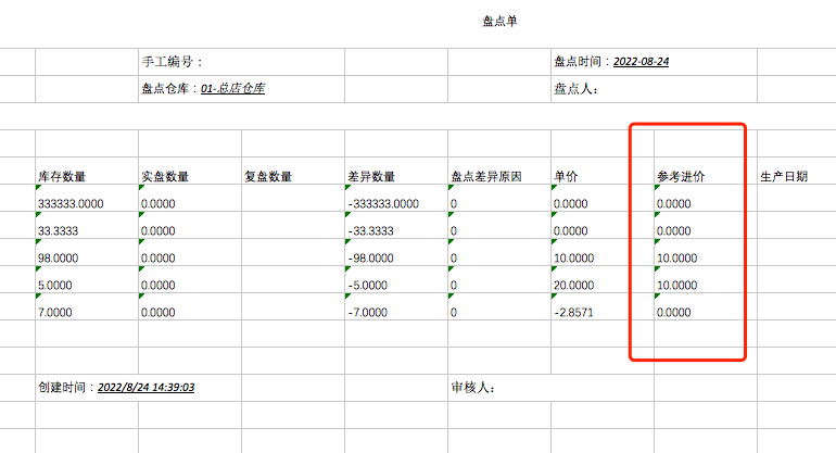 库存管理“盘点单”单据明细-导出适配显示【参考进价】