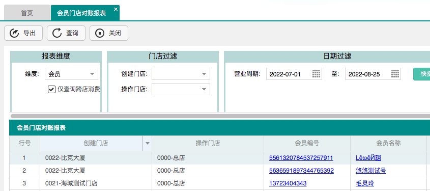 会员管理“会员门店对账报表”增加【只显示跨店消费】过滤查询